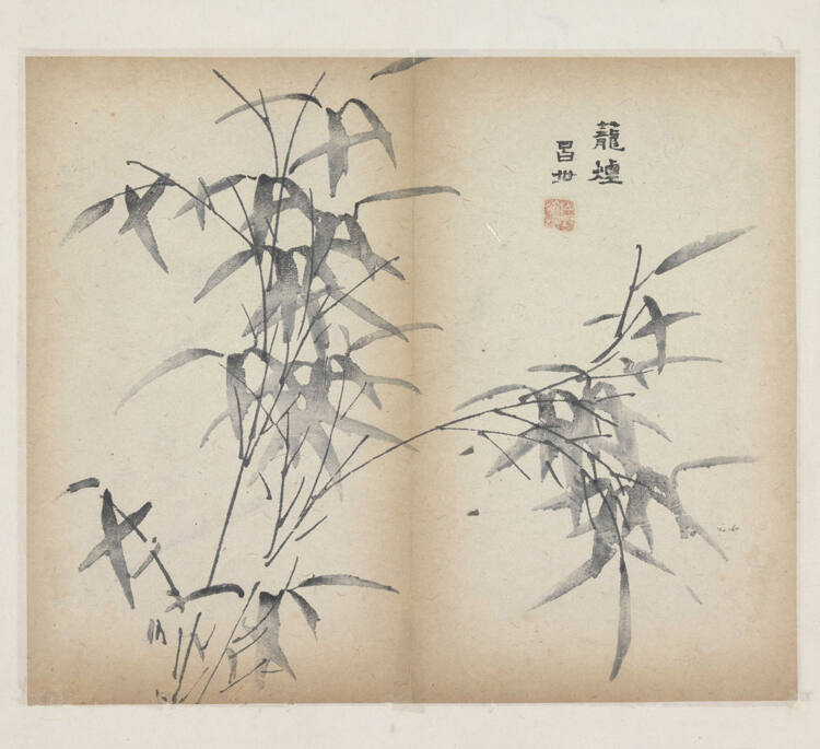 DescriptionPrint of several shoots of bamboo, with inscription, in shades of gray.