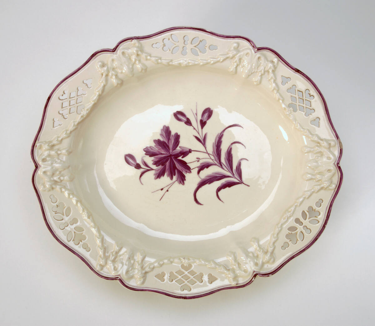 DescriptionSmall shaped oval contour plate with reliefs of swags and cascades. Purple banding on rims decorated with purple floral sprays. Pierced designs.Provenance