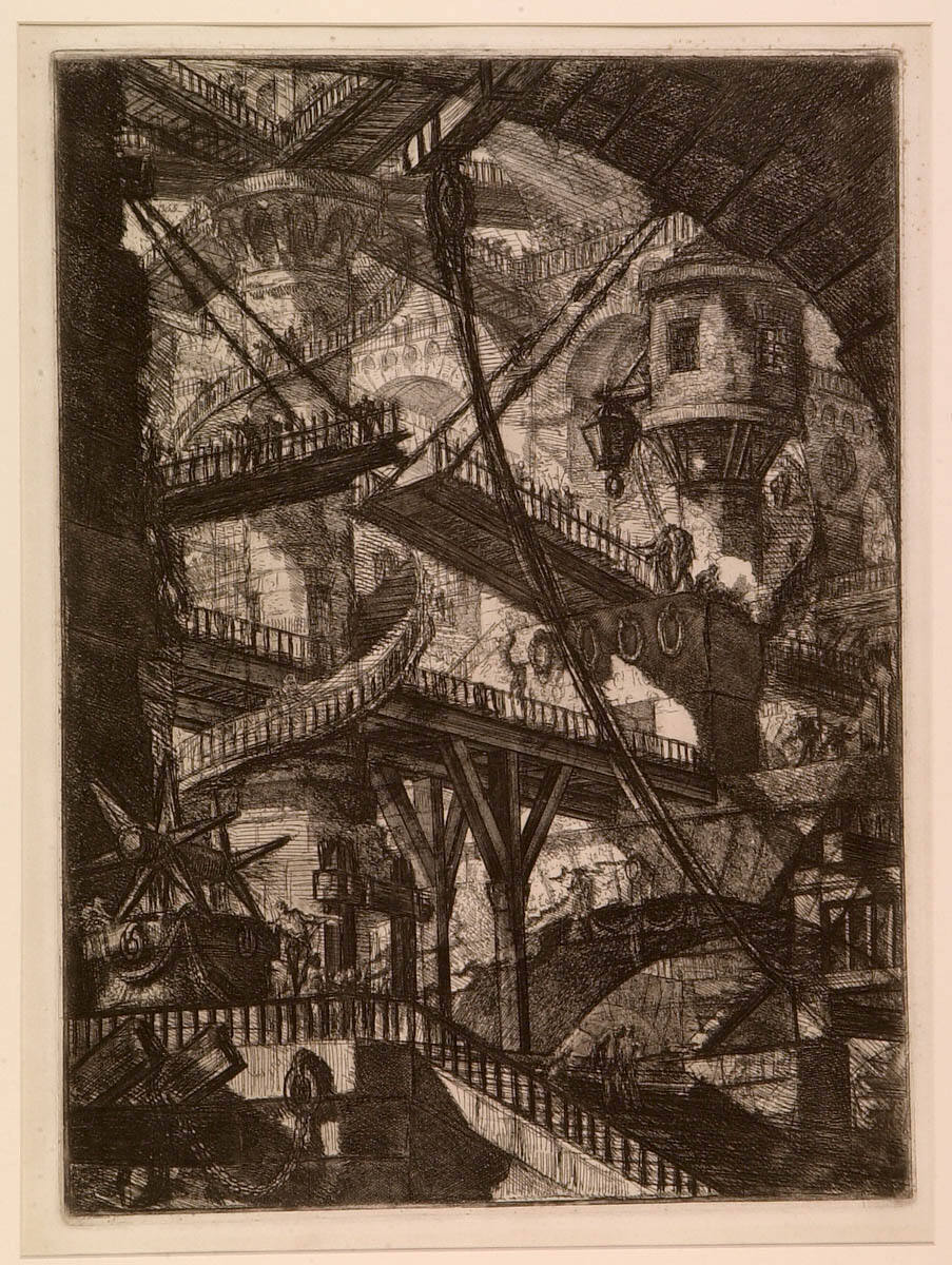 DescriptionInterior with railed stair, right to center, and landing with windless atop plinth, l.m., round column beyond with winding railed staircase circling it and rising to top where it supports crossing bridges. supported by two trestles: above it, partly opened drawbridge, two cables 1. and 2. cables, right, stretching beyond third bridge, supported by arches, and beyond partial stone arch, top right center. cap-roofed cylindrical tower above column with diagonal supports. cables extend from below arch, lower right.