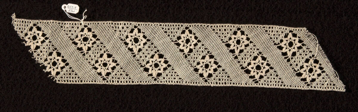 DescriptionBobbin-made straight lace showing some Torchon-like features but combined with a bolder pattern and the use of wheat-ears.