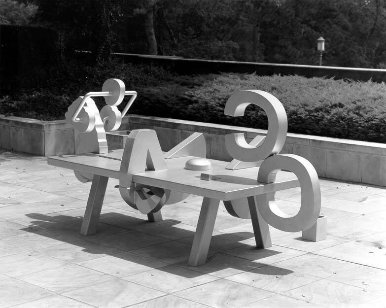 DescriptionLarge silver metal table–around the tableat the head, foot, two on one side and one on the other–are abstract, mostly geometric, forms of the same silver metal attached to the edge of the table. abstract interpretations of people at their places. fairly flat geometric forms of the silver metal representing dishes.CopyrightThis work is copyrighted. Contact the copyright holder for permission to reproduce.