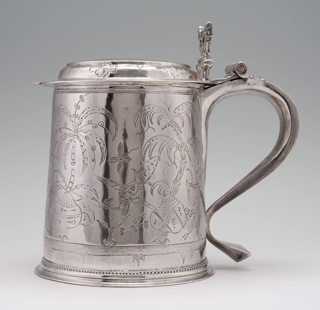 DescriptionTruncated conical form with wide flat handle having flaring tail, pierced entwined double-dolphin thumbpiece. Handle marked in punchwork: *I S* with scrollwork (see card). Triangular upper section where handle joins body hollow and pierced with trefoil at top, five graduated circles below. Decorated with engraved chinoiserie: body and cover chased with palm trees and birds. Base decorated with punched bead work. Cover extends beyond body and is slightly domical. Four marks on bottom.
