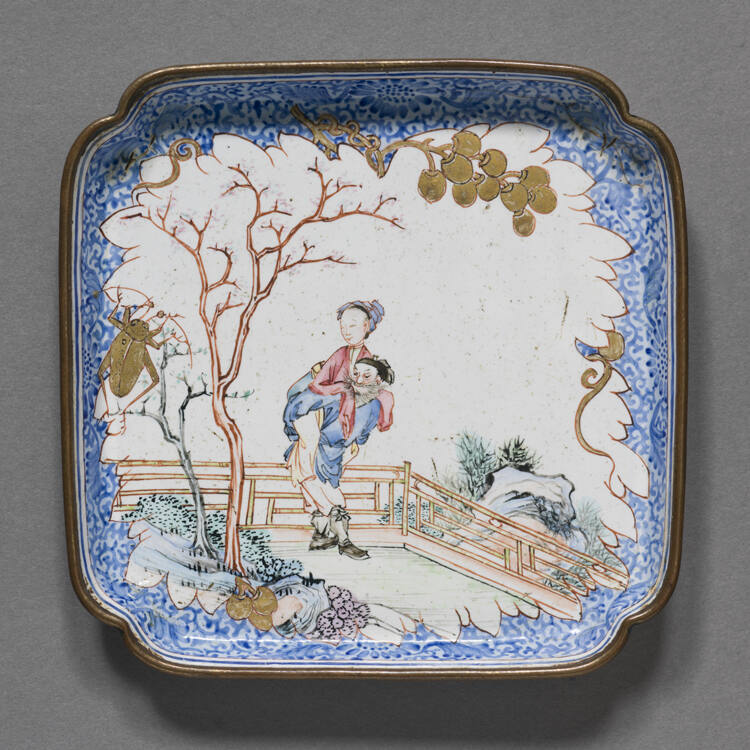 DescriptionChien Lung Canton square saucer with quatrefoil corners. One of a set of six wine cups and saucers decorated with scenes depicting old stories of the twenty-four paragons on filial piety. This saucer depicts a man with a mustache carrying a woman on a balcony with a rail.