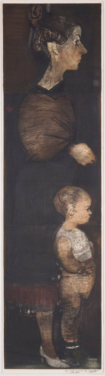 DescriptionFull-length standing figures of woman and small boy facing right. Prow-nosed, hand-clasped woman wearing hair in upswept bun, dressed in dun-colored blouse, dark grey skirt with brown-red bottom stripe, white shoes; bare-headed child in sleeveless white shirt, tan jodhpurs. Black ground. Small green areas behind and above head and in front of neck. Right margin, on floor, bottom 3-plate print.Copyright© Estate Mauricio Lasansky