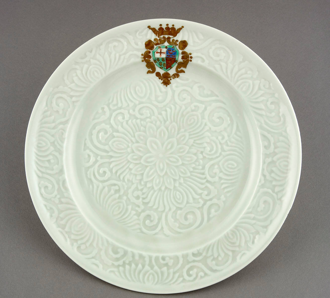 DescriptionPlate with depressed center and 1 1/4 " wide rim, raised white on white patterns of floral, S and C curves on rim and in center, smooth areas at outside edge of rim and outer part of depressed area, armorial design in gold leaf, red, blue and green placed at one side.