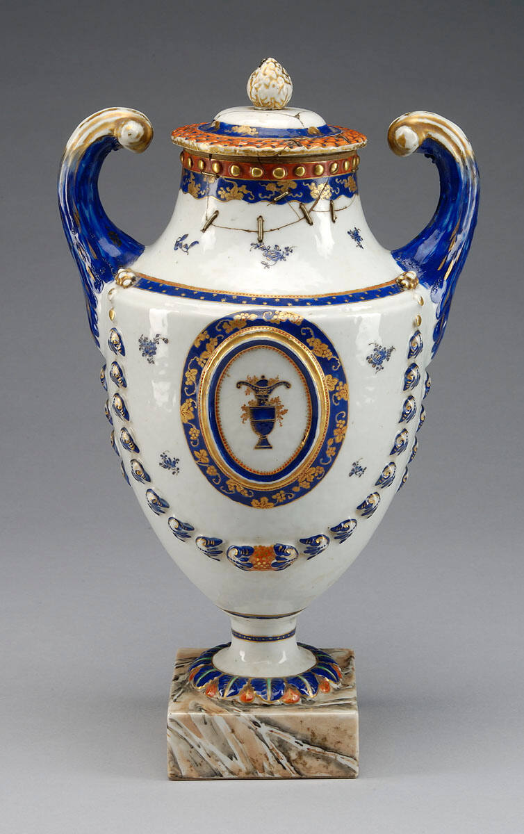 DescriptionUrn-shaped vase with marbelized base. Lowestoft ware in white with blue handles. Medallion on each side encircled with festoons.