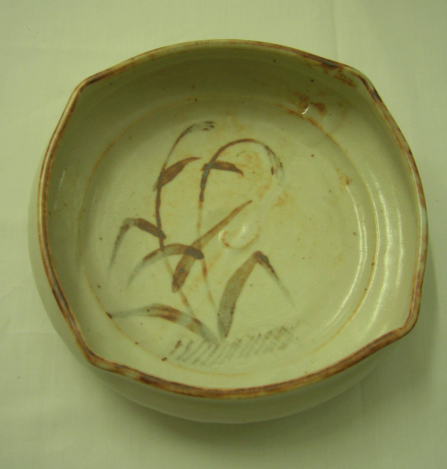 DescriptionWheel-thrown pale buff body covered with whitish Shino-type glaze; underglaze iron oxide decoration in central depression of wild grasses; rim rubbed with iron oxide to affect oxidation of iron impurities in body; considereable iron oxide burning on unglazed areas of bottom.CopyrightThis work is copyrighted. Contact the copyright holder for permission to reproduce.