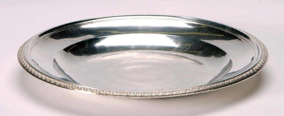 DescriptionWide rim is decorated with an athemion design. Each has the coat-of-arms with fleur de lis, wreath, crown above and croix below on the rim.