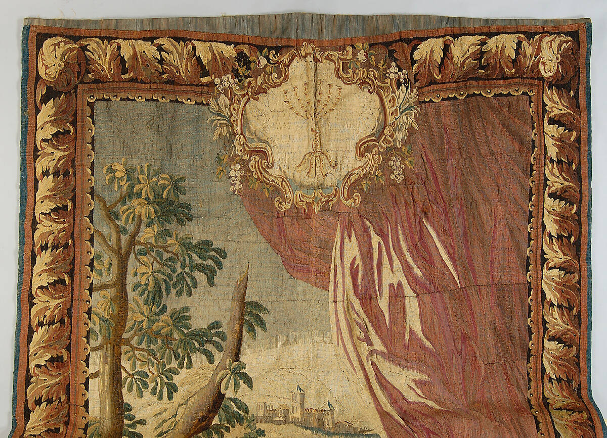 DescriptionHand-woven portiere with large tree design and houses and birds with drapery design at side and border. Lined with tan-flowered brocade. The border made of a leaf motif. Outstanding colors are all browns-beige, pinks and roses, red and blue. They are lined with a tan brocaded twill fabric, with a polychromed brocading.Provenance