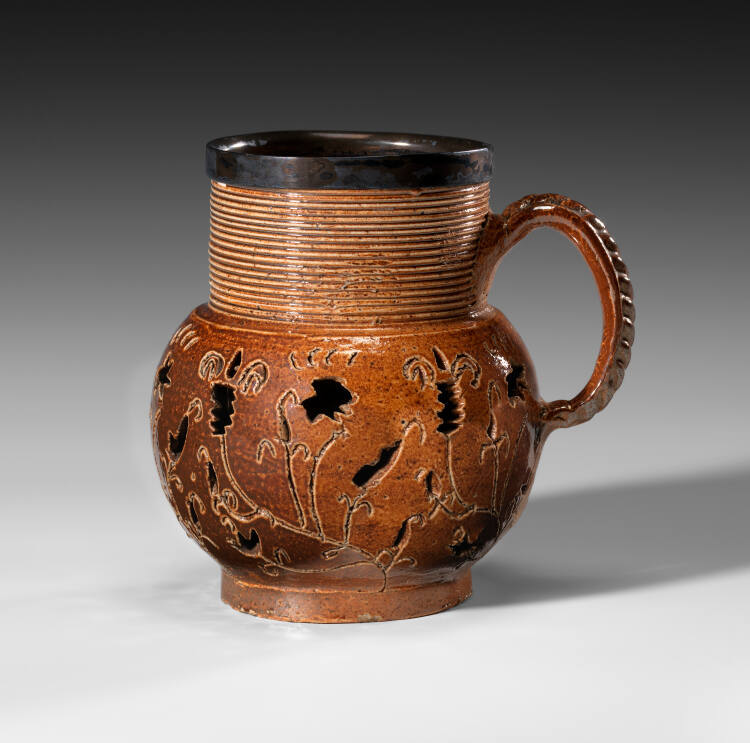 This double-walled mug with pierced decorations in the outer wall is an example of carved stoneware from Nottingham.