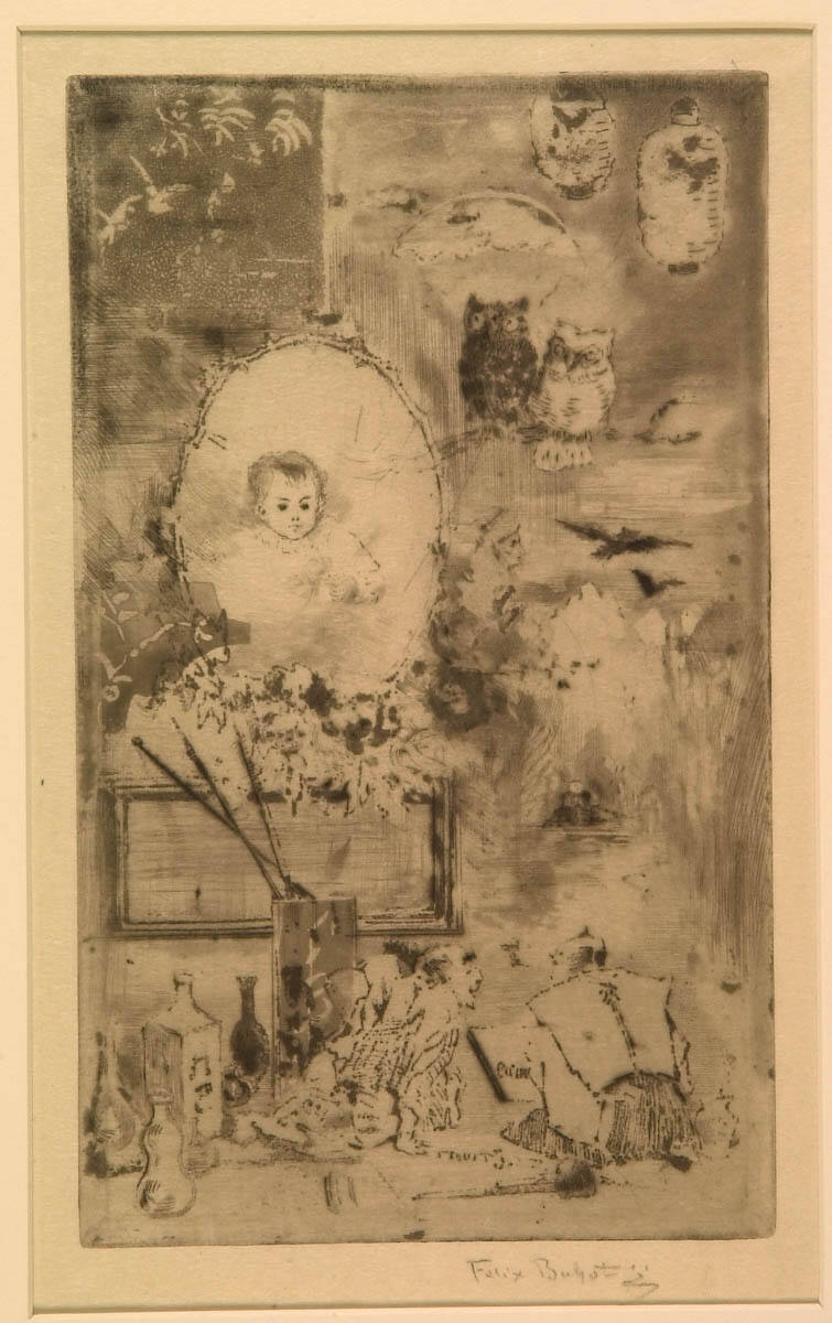 Félix Buhot was trained as a painter but found his true calling as a printmaker. Here he creates a charming portrait of Jean, his baby boy, surrounded by motifs inspired by Japanese art and culture. Known as japonisme, this stylistic inf luence can be seen in the paper lanterns, owls, ceramic vessels and crouching men that Buhot brings together into decorative vignettes. Japonisme reached its peak in the last quarter of the 19th century and made a strong impact on the art of Claude Monet, Vincent van Gogh and Paul Cézanne, among others.