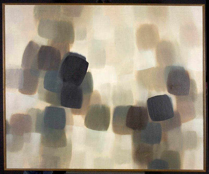 DescriptionLarge squares of black, light and dark brown, light and dark grey, pale green randomly distributed top left and right; lightest sections, center, and lower left quadrant.Copyright© Estate of Eugene A. Bavinger
