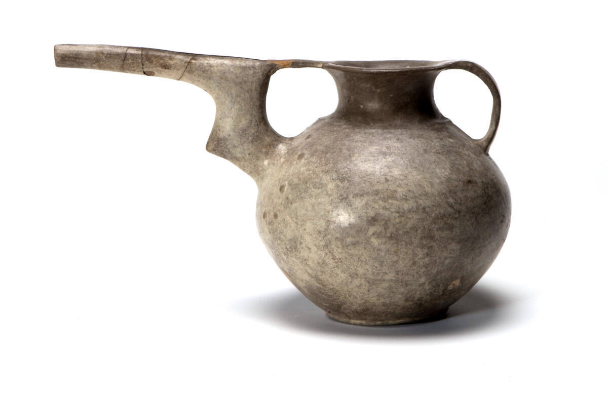 DescriptionGrey pottery pitcher with long narrow spout and small semi-circular handle. Remnants of bronze collar within the neck.