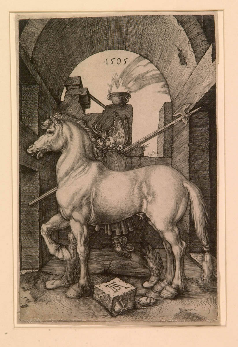 Gallery LabelAlbrecht Dürer believed that the essence of true form, both human and equine, corresponded to a system of proportion and measurement. Order and harmony prevail in this print of a muscular, perfectly proportioned horse and his groom. The horse stands with his right foreleg raised in a pose that reveals the influence of ancient equestrian sculpture. The groom strides in unison with the horse, clearly in command of the animal that he has tamed. The architectural vault that contains the figures contributes to the sense of balance and control.
