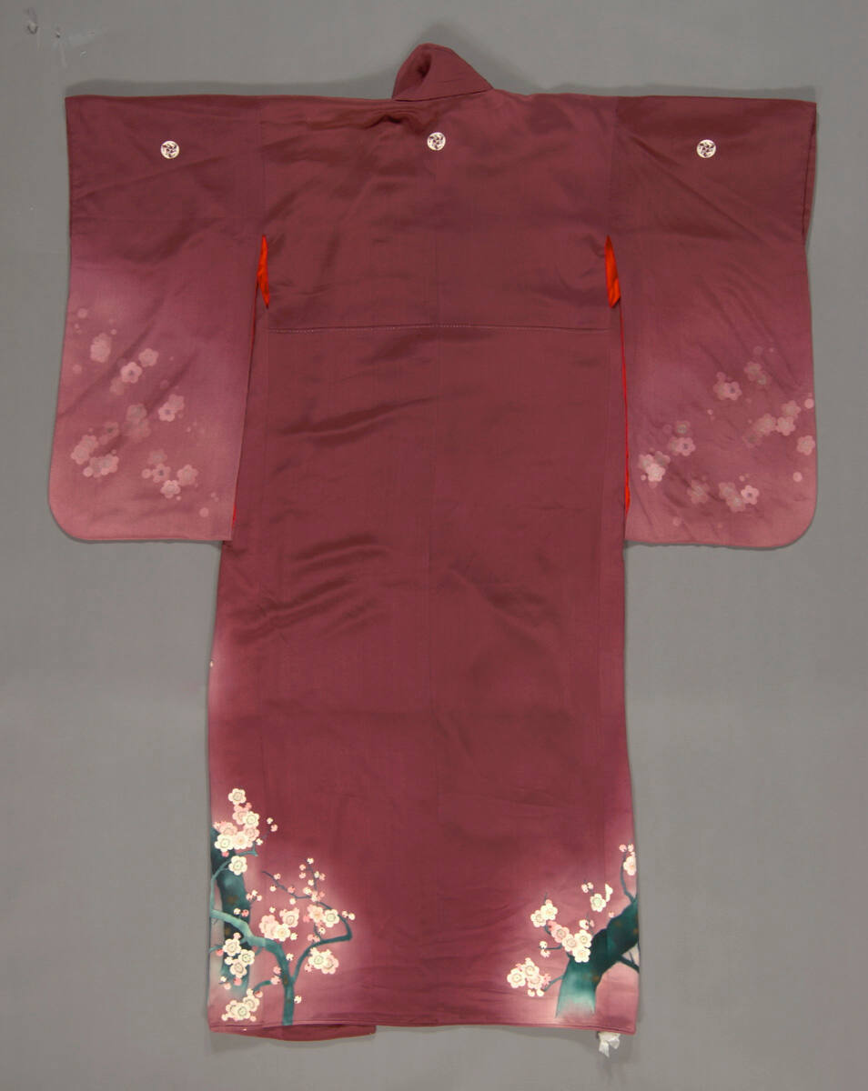 DescriptionPurple ground silk with new yuzen painting, embroidery, with design of pheasants and plum trees.