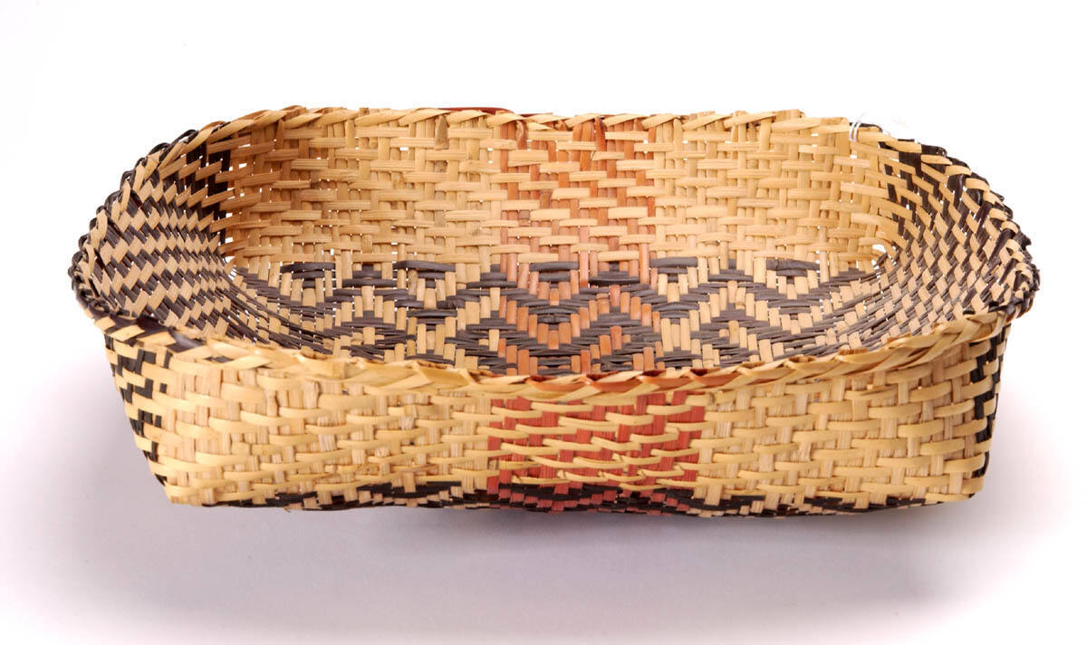 DescriptionSplit cane twilled basket, shallow with a roughly square mouth and rounded bottom, woven with three colors of cane in different diamond pattern or zig-zag designs.