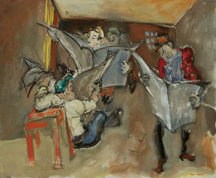 DescriptionFour men, one seated on floor against a red stool, read large newspapers.Published ReferencesDoris Brian, “E Pluribus Weber,” Art News 40 (15–28 February