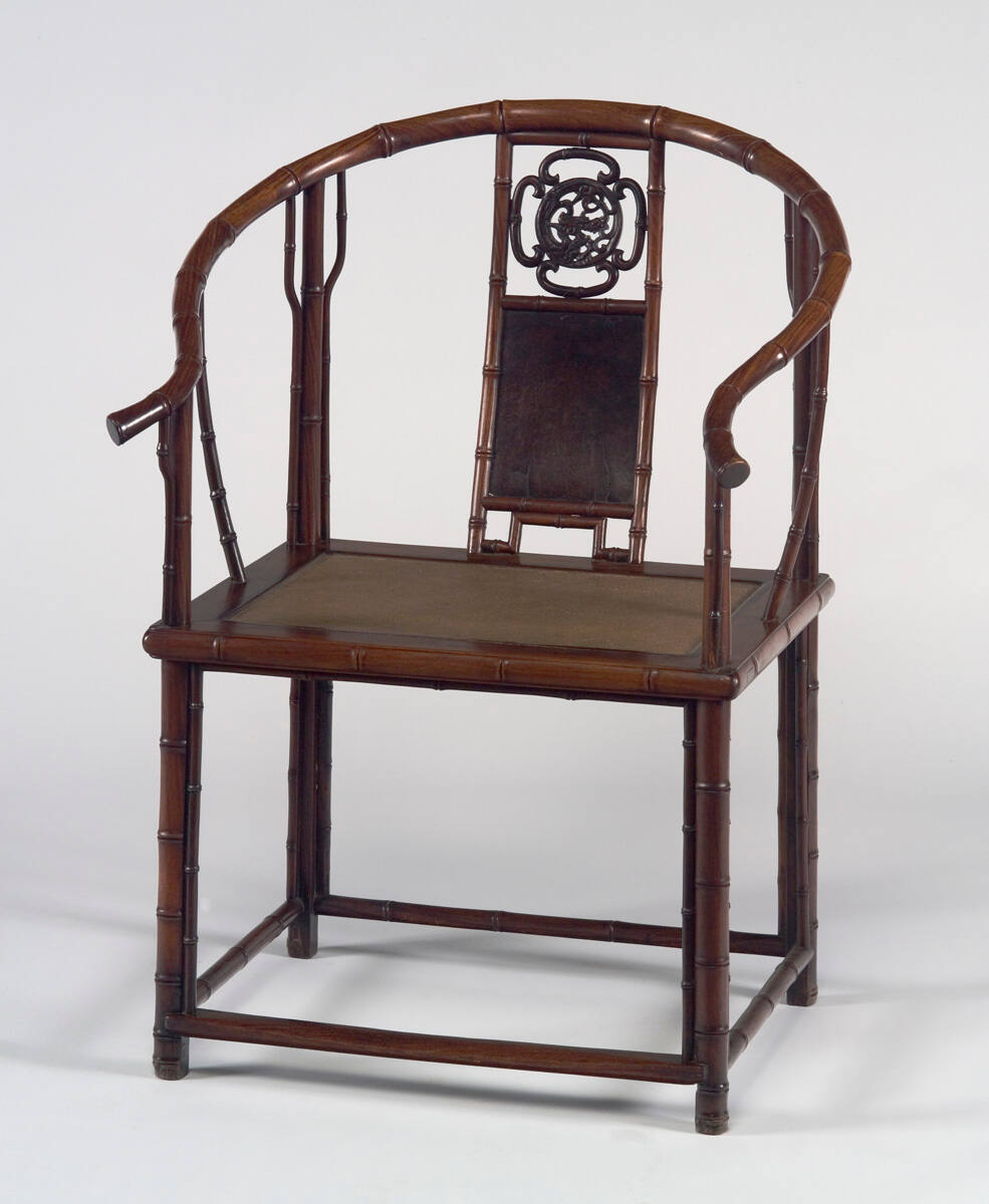DescriptionOne of a set of four huanghuali horseshoe armchairs carved to simulate bamboo, the five-part backs have exposed tenon overlapping pressure pin scarf joints, with a frame splat with a dragon roundel and huamu panels. The front and rear posts continue through the seat frame to form the legs which are square on the inside edge beneath the seat frame; these are joined by stretchers at the same height. A similarly carved spandrel is fixed to the rear posts and an apron pegged to the inner edge of the legs and sear frame. The soft matting seat has been replaced with hard mat. Kangxi Period, probably late 17th-early 18th century.