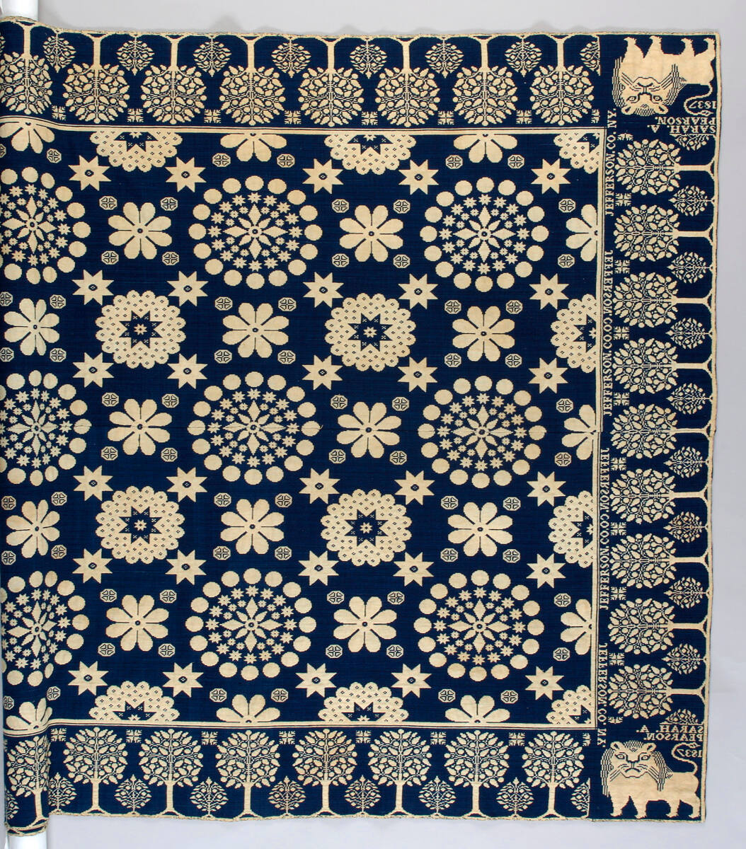DescriptionBorder of trees with lion in each corner. Pattern of stars, flowers and circles on blue background. Woven in each corner of one border edge is :"Sarah A. Pearson - 1838". Across bottom edge of same border: "Jefferson Co. N.Y.".