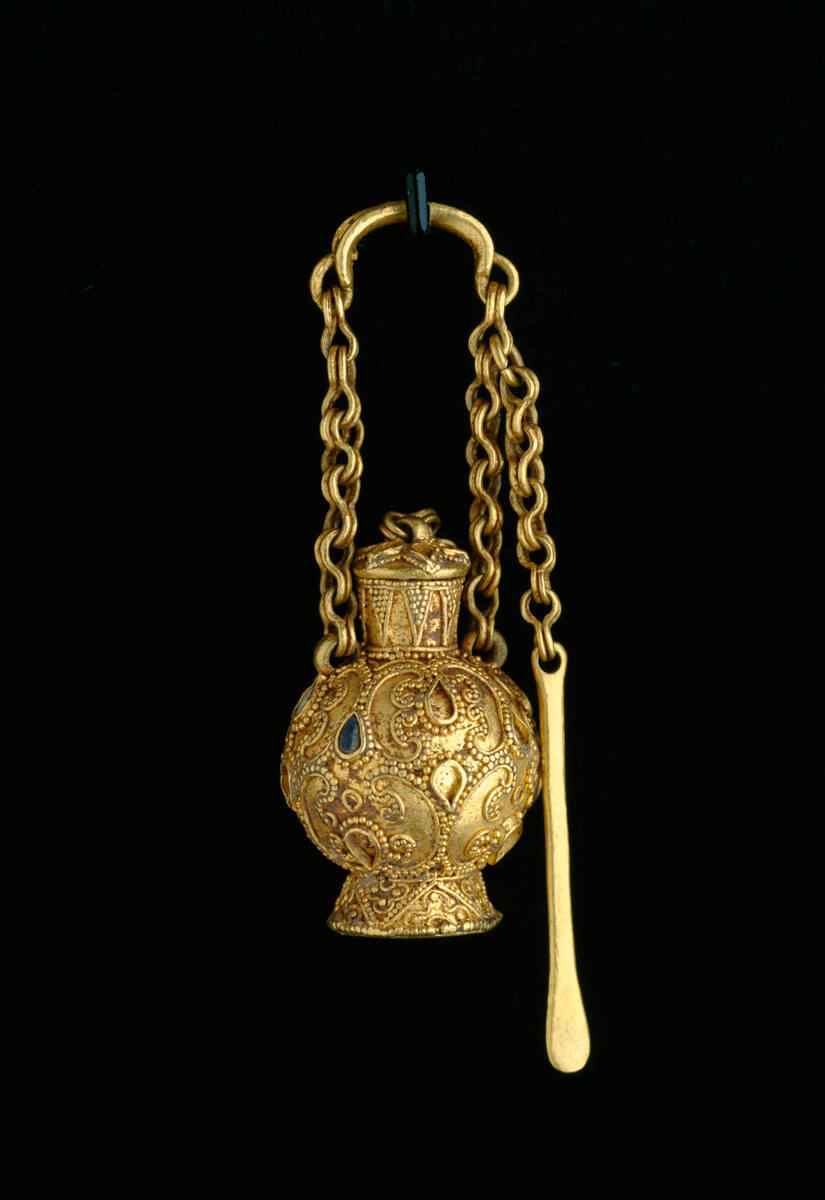 DescriptionGold bottle with turquoise inlay. Spreading foot, swelling body, narrow neck, lid with short chain. Chain attached to ring at shoulder on either side with applicator attached. Granular scrolls with turquoise in leaf shaped designs.Exhibition History