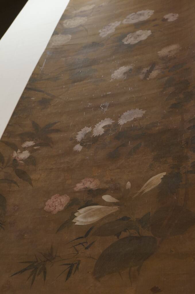 DescriptionMallow flowers and chrysanthemums. One of a set of twelve hanging scrolls representing flowers of all seasons.