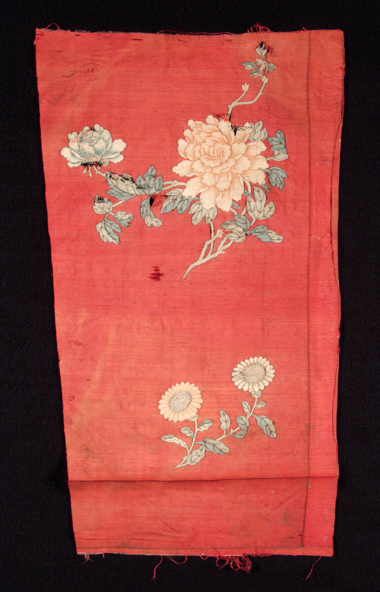 DescriptionTerracotta colored background, sprays of chrysanthemums and daisies in creams and blues.