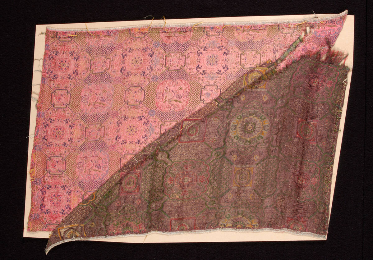 DescriptionTwo fragments of brocaded satin mounted togehter. One of rose satin the other of dark purple brocaded in polychrome. Design of conventionalized flowers in formal pattern.
