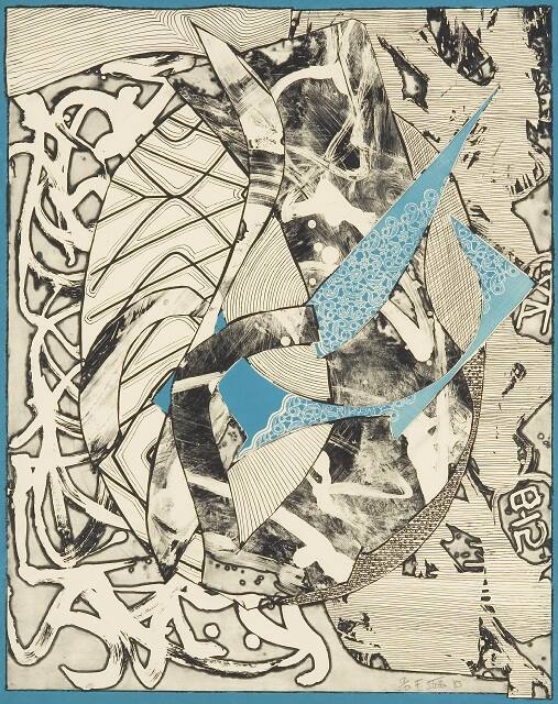 Stella's early prints were like his paintings: austere, rigidly geometric and emotionally detached. During a prolific experimental period, Stella's prints became more visually complex, combining mottled color, meandering lines and layers of texture and asymmetrical forms. The Swan Engravings series, to which this print belongs, was inspired by the Swan Engraving Company, which supplied laser-cut shapes of magnesium and aluminum used to fabricate Stella's relief paintings of the 70s and 80s. Some of the metal remnants from that process were combined with other recycled materials to print the complex image of Swan Engraving Blue.