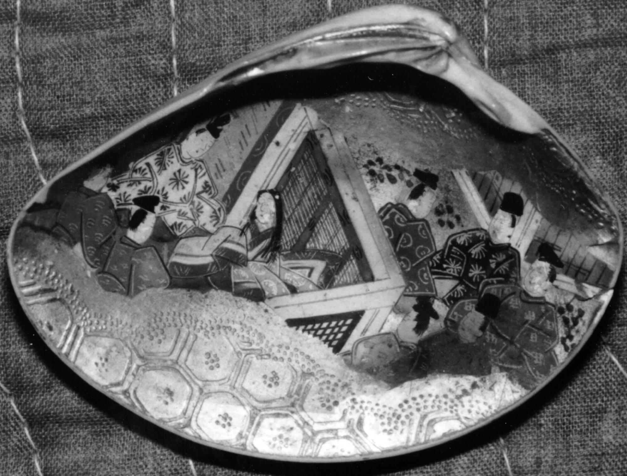 DescriptionOne of fifty clam shells. The shells are slightly smaller than a human palm, decorated with paintings on gold paper pasted to the iridescent inside surface. The top and bottom portions of the paper of each shell is embossed with hexagonal patterns. The images in the middle are mostly interior scenes with figures in bright Japanese costume. Men appear in rigid court robes. Women's long black hair streams down their backs. The paintings are peeling off at the edge. The shells were formerly stored in two gridded wooden boxes, 25 in each.Gallery LabelThese shells were used in the shell-matching game, kai-ooi, especially popular at New Year’s time. Two sets of shells, containing 360 pieces, were painted with identical scenes from classical Japanese novels, such as the Tale of Genji here. One set would be placed face-down in front of the players, and the second set remained in a box. Players removed the shells one at a time from the box. They looked at the scene on the shell and attempted to find its mate by turning over one shell from the other set at each turn. The one with the most pairs at the end of the game was declared winner.