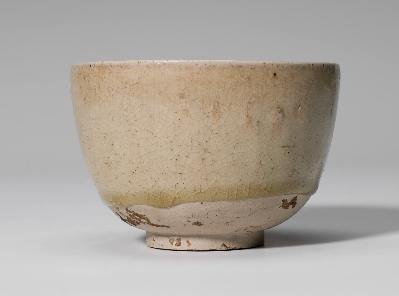 DescriptionPlain, deep cup of almost hemispherical form with straight sides flaring slightly at the lipless rim and rounding toward the base with solid foot, the hard grayish-white stoneware covered with a translucent greenish glaze speckled with natural impurities and showing a fine network of crazing lines, the glaze ending well short of the foot and pooling to a deeper color at the edge.