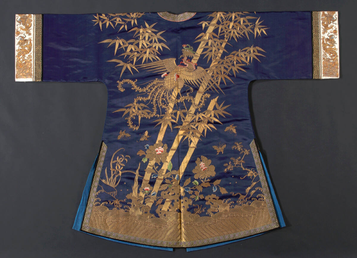 DescriptionDark blue satin embroidered with design of phoenix in bamboo tree, flowers, bats, rocks and water in couched gold thread. Sleeve bands of white satin with dragons in couched gold thread. (Sleeve bands are a later addition)