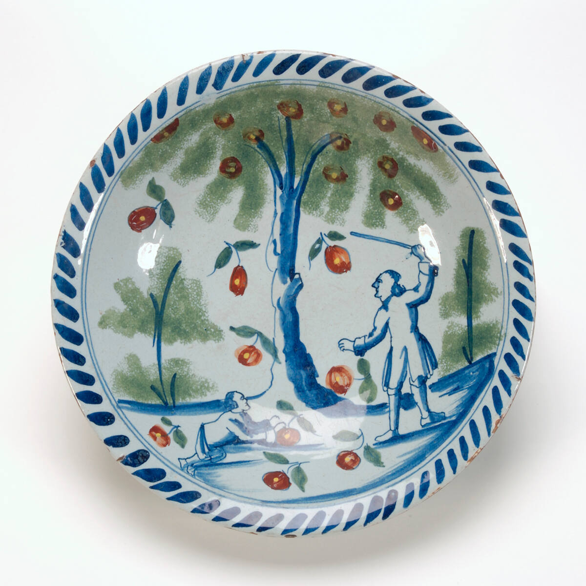 DescriptionDepicts an apple tree in dark blue with green foliage and dark red fruit. Prone boy, left, steals apples while man, right threatens with upraised stick. Blue-dash border. Tin-glazed in gray-blue.