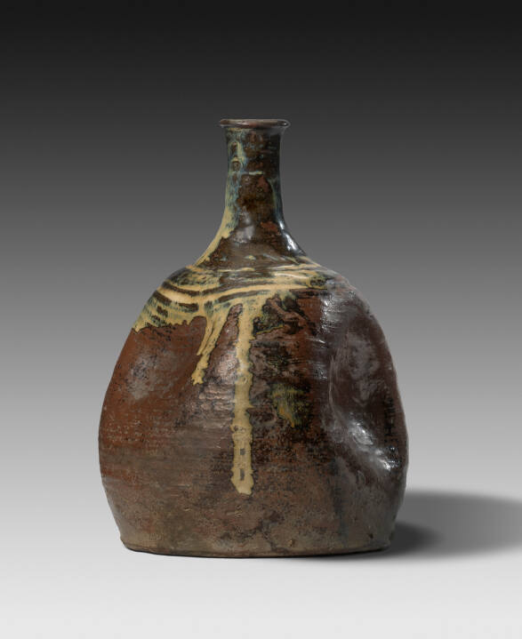 Gallery LabelThese bottles were used for serving sake. In the 19th century, local kilns manufactured large ceramic bottles for distributing sake, and also made smaller serving bottles. Here, the bottles were used by commoners. They are distinguished from finely made ceramics by their sturdy forms, simple embellishments and casual designs. Their rustic and simple elegance was highly prized by the advocates of the Mingei (folk art, or art of the people) movement, which believed the embodiment of art could be found in the functional objects that were made from natural materials.
