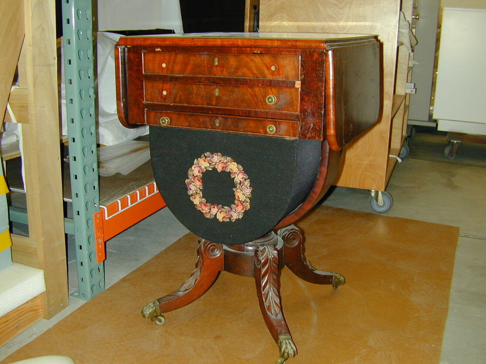 DescriptionDuncan Phyfe style; drop leaf table set on carved spreading feet. Deep drawer with petit point front (wreath of flowers). Two other drawers above.