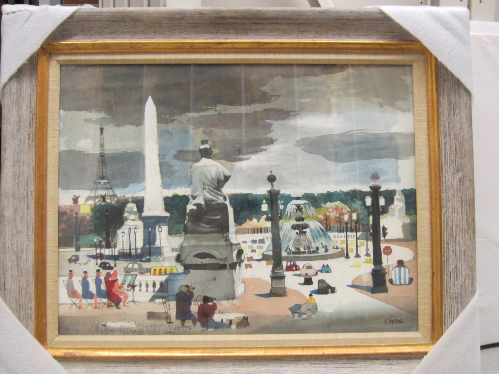 DescriptionLeft rear, Eiffel tower, beyond line of trees across low horizon. Middle, statue and obelisk, left, three-tiered circular fountain right. Seated painter with four seated onlookers, left, two photographers, center, traffic center and right; two pairs of ball-topped columns, left rear and lower right corner. Cat and dog in grass, lower left, and two cats, bottom center; gray-clouded sky.Copyright© Estate of Dong Kingman