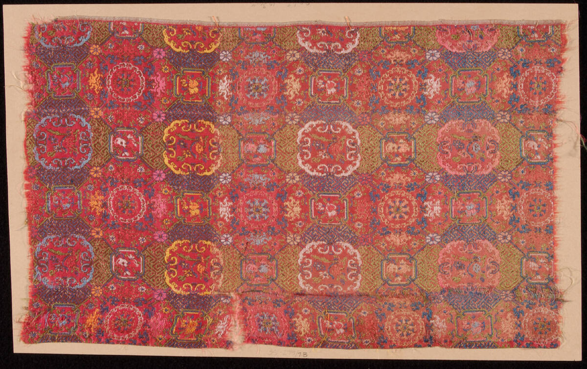 DescriptionRose colored satin brocaded in polychrome. Design of conventionalized flowers in flormal arrangements.