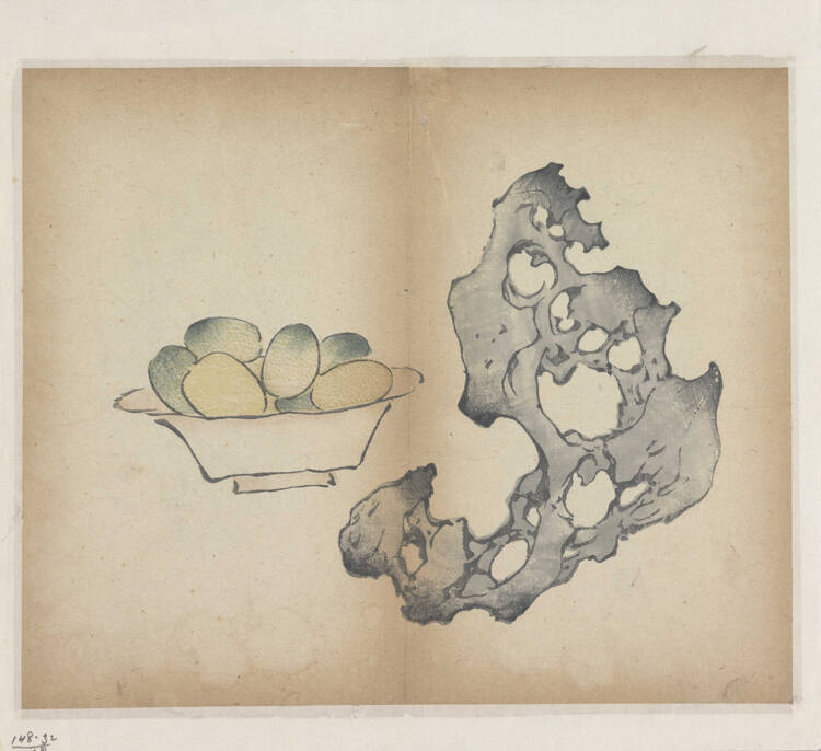 DescriptionStill life print of a rock formation sitting next to a bowl filled with limes, in green, yellow, brown, and gray.