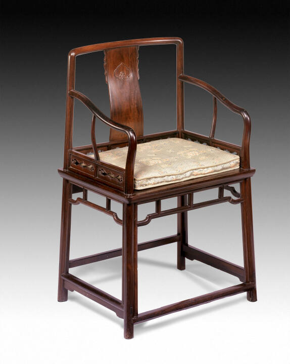 DescriptionA low-back armchair with a horizontal toprail which curves at the ends to receive the tenons at the top of the rear posts (known as a pipe joint). The rear posts, which taper to this joint, splay slightly and pass through the seat frame to form the back legs. The short S-curved splat is tenoned into the underside of the toprail and into the toprail of a three-part framed frieze which, in turn, appears to be tenoned into the inside edges of the rear posts. The downswept arms are joined to the front posts, probably by a tapering dovetail tenon, and the front posts also continue through the seat frame to form the front legs. A two-part framed frieze is tenoned between the front and rear posts with a central tapering rat-tail post joining it to the underside of the arm. The splat carved with a ruyi-shaped medallion with interlocking ends is flanked by shallow spandrels with raised beaded edges. The slightly recessed panels in the friezes are tongue-and-grooved into the inside edges of the rounded frame members and pierced with a shaped openwork design terminating in small ruyi medallions. The seat was originally drilled for soft seat construction but now has a hard matting seat with replaced matting but probably the original trimming strips. The outside edge of the seat frame is of gently curved shape with a square shoulder below. The hump-back aprons, with mitred, mortise and tenon joints at the hump are mitred and tenoned into a similarly molded frame which is affixed to the inside edge of the legs and to the underside of the seat frame. The box frame stretchers are of ascending heights with short-eared aprons to the footrail and side stretchers. Late 17th century significantly modified in the 18th century.Gallery LabelLowback chairs were less formal than high-back chairs and were reserved for lower ranking guests; they were also less comfortable, since the lower back afforded less support and the back panel was straight rather than S-shaped. The S-shaped panel on these two chairs shows that they were originally high-back chairs. They were probably cut down in the 18th century, when low-back chairs became fashionable. Zitan (purple sandalwood) was the most prized of all woods, so these chairs would have been very valuable.