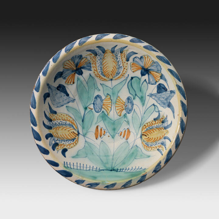 DescriptionDecorated with tulips in yellow, orange, and blue. Other flowers, perhaps poppies, represented in orange and blue. Leaves, extending from bottom through center, light blue-green.Gallery LabelOrnamental ceramics, such as these chargers with stylized tulips, and sculptures, as seen in the Jan Steen Fantasy Interior to your right, often decorated the tops of large cabinets in the 17th and 18th centuries. The chargers reflect "tulipomania", the European craze for these flowers. The tobacco jar's central cartouche signifies that it once held tobacco from Saint-Omer, a French tobacco producer. The jar's two American Indians smoking long pipes symbolize the first American tobacco imported into Europe.