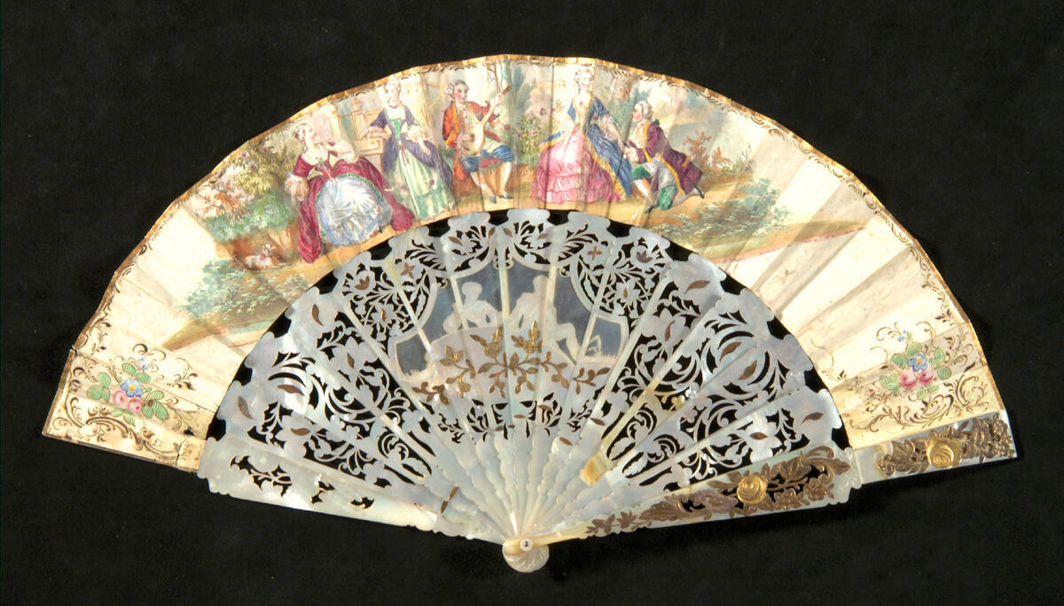 DescriptionCarved pearl frame with gilded decoration. The fan of paper, painting of sacrifice to Cupid. Musical scene on reverse.