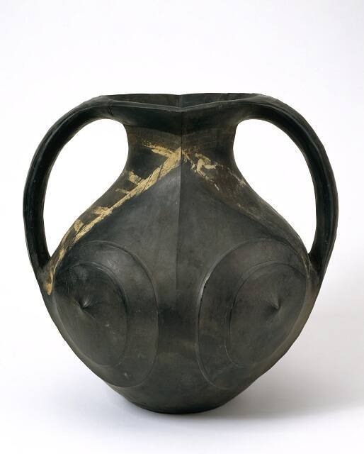 DescriptionA dark grey two-handled vessel decorated with two pairs of large "eyes" on the main body and white decoration under the handles.. The eyes are defined by wide concave borders edged with engraved lines; each is centered with a pointed boss incised with an "X." They are separated from each other by a central ridge on each side of the globular body. The steeply sloping shoulders rise from the body to a short neck decorated with a collar of three rows of fine vertical ribs under a flared mouth. The rim is shaped as a pointed oval, with two sharp points that correspond in placement to the two ridges on the body below. The opposite ends of the rim extend down to two broad arc-shaped handles, each embellished with two concave circular indentations below a pair of curving shallow grooves radiating from the edge of the lip. The smoothly burnished surface shows extensive remains of a white painted lattice design under the handles.