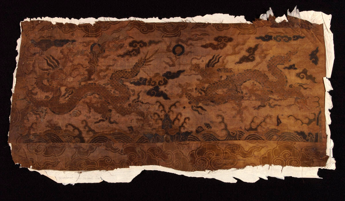 DescriptionBrown satin damask brocaded in gold and black, tan and brown. Two dragons chasing flaming jewels, clouds and waves. Part of a coat.