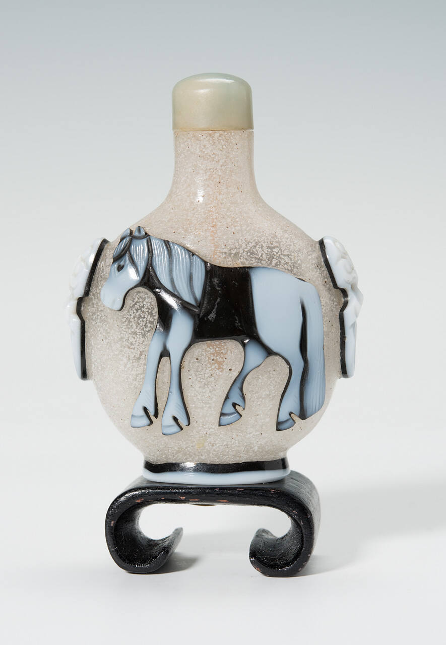 DescriptionSnowflake Peking glass moon-shaped bottle with black and white double overlay decorated with horses on each side, animal mask and ring handles on shoulders, with gray jade stopper.