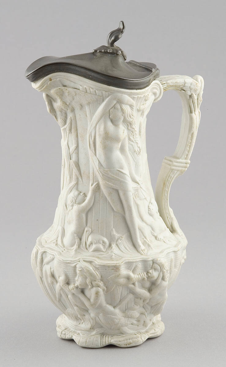 DescriptionWhite jug with handle and hinged pewter lid. Decorated in high relief, with two female nudes on either side. Smaller figures rise up towards the two nudes. Bottom of jug decorated with torsos of four children, two of which are blowing on conch shells.