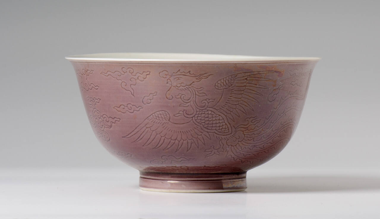 DescriptionOne of a pair of small bowls glazed a light aubergine on the exterior, and white on the interior. The exterior is engraved with designs of phoenix and dragons among clouds under the glaze.Exhibition HistoryEmperors, Scholars and Temples: Tastemakers of China’s Ming and Qing Dynasties, The Nelson-Atkins Museum of Art, August 12, 2016 – July 9, 2017.