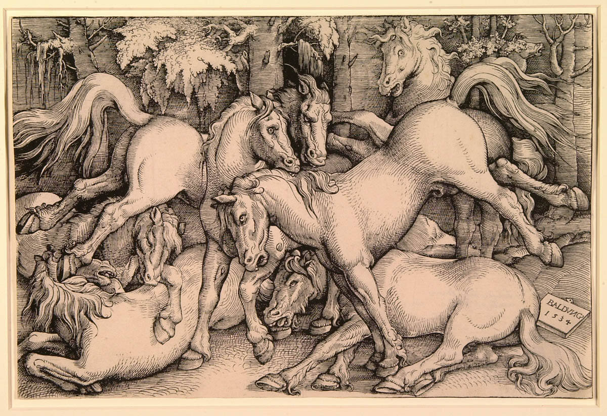 Gallery LabelHans Baldung Grien, Dürer’s most talented and successful disciple, enjoyed lasting fame for his unusual approach to traditional subject matter. This woodcut is one of three prints depicting the mating behavior of a herd of horses in a dense forest. Seven stallions with bulging eyes and bared teeth form a tangle of limbs as they bite, kick, and tear at one another. Their frenzied violence served as a metaphor for the power of unbridled human passions.