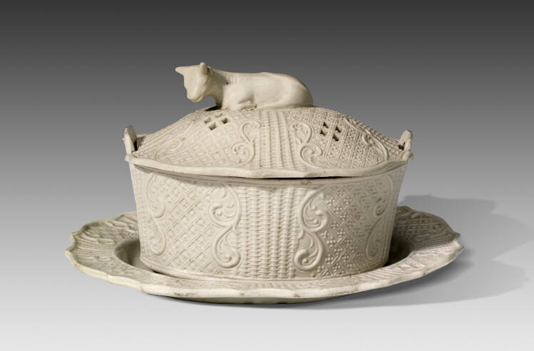 Gallery LabelBoth stoneware and salt glaze were introduced to England from Germany in the 17th century. Salt-glazed stoneware is created by adding common salt, a composition of sodium and chlorine, into the chamber of a hot kiln; the sodium acts as a melting agent and reacts with the clay's silica causing an orange-peel texture. First practiced in London, the medium spread to Staffordshire around 1720. Here, it reached its highest level of technological development and its most varied range of types and forms.