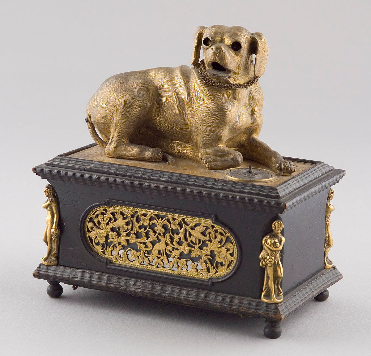 DescriptionShaped like a chest, with large brass dog on top. Ormolu panels in middle or each side with figures supporting corners. Time indicator on top.ProvenanceAlbert Schloss [1];