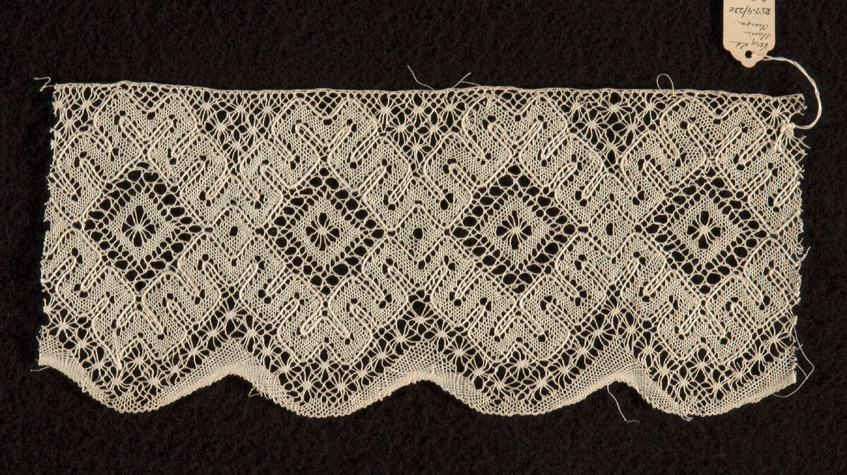 DescriptionBobbin-made tape lace of the Torchan type, but with a thick, outlining thread.