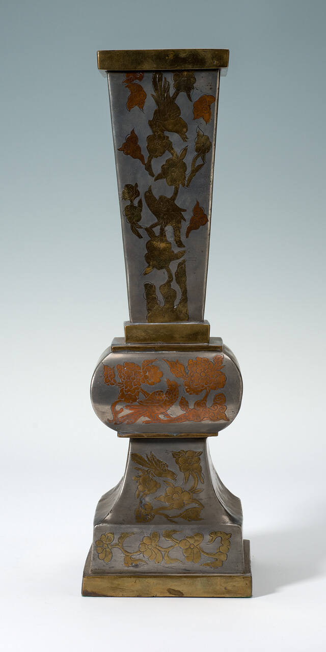 DescriptionPewter vase inlaid with designs of birds and flowers in brass.ProvenanceWith the North China Art Trading Co., by 1933;